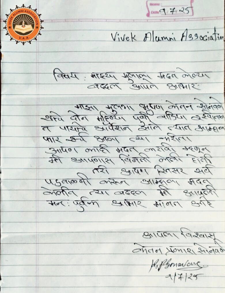 Vivek Alumni Association has provided financial help of Rs. 30000 to cover his surgical expense. This financial medical support will help them cover the entire cost of Bhushan’s surgery and ongoing treatment as on date.