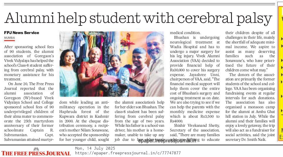 Vivek Alumni Association funds Crucial Surgery of Class 8 student with Cerebral Palsy